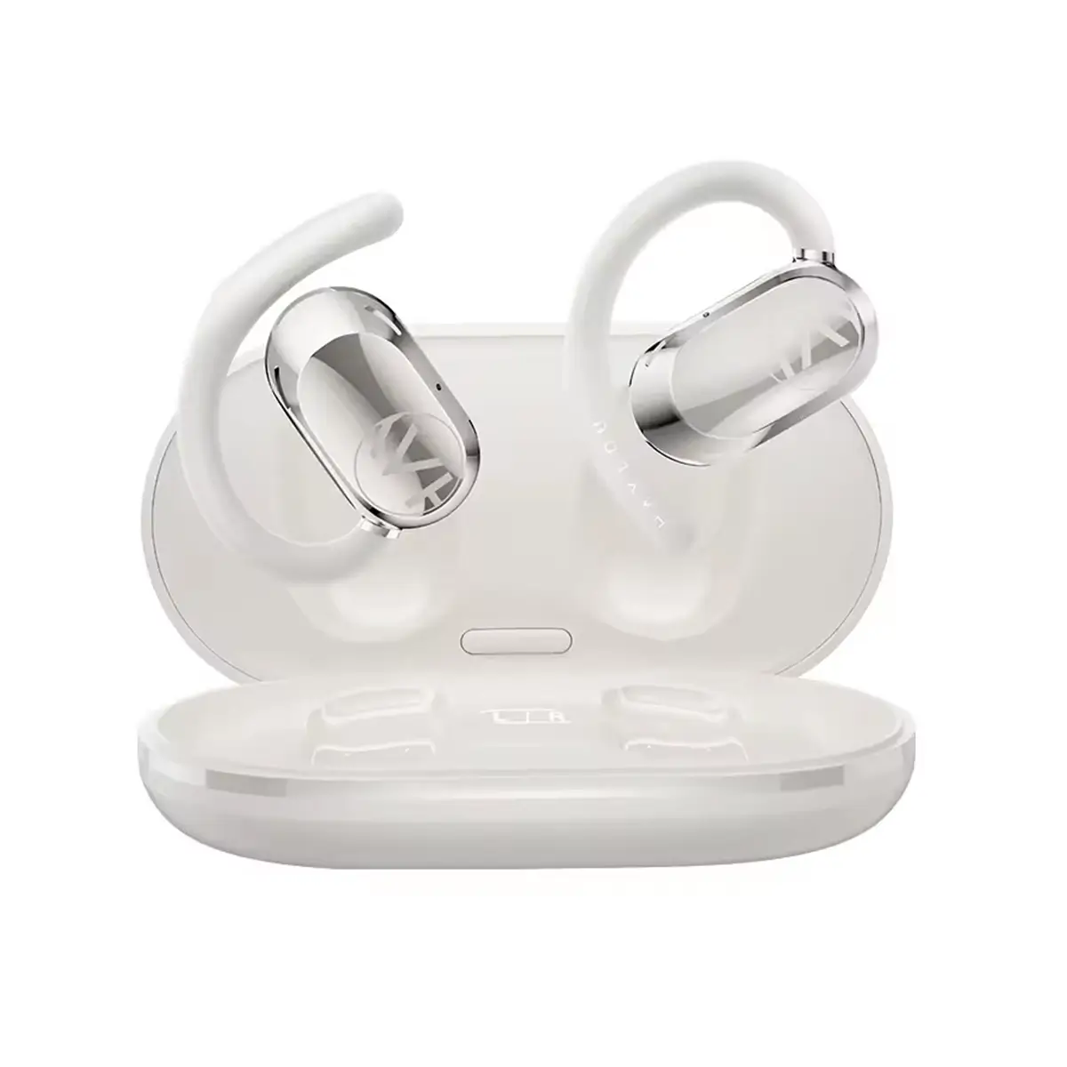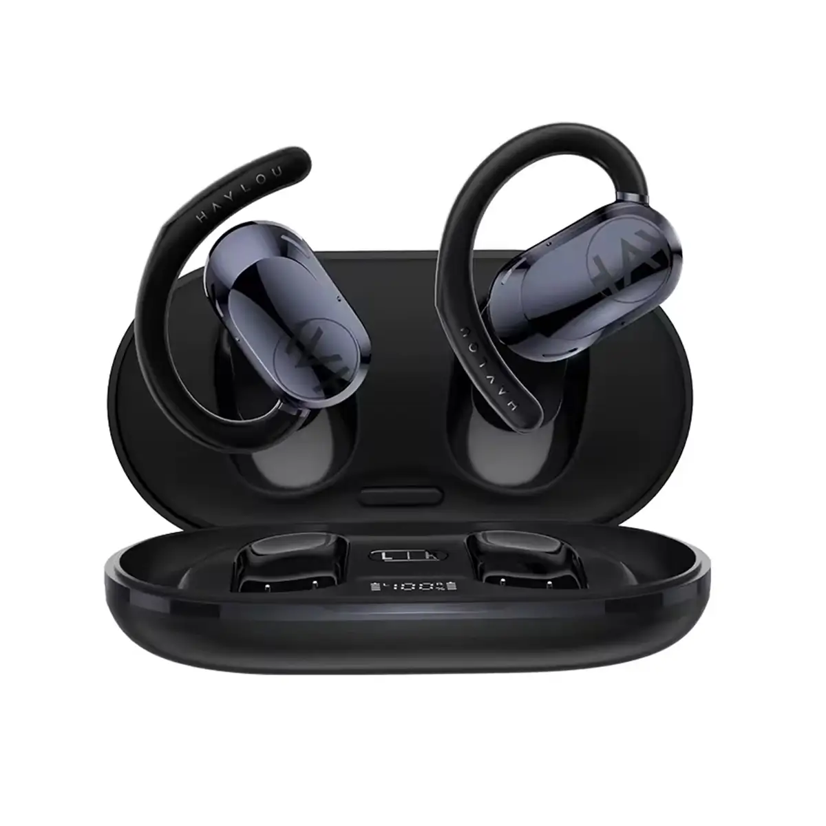 روی کیس و هر کدام از گوش ها قسمتی از نام برند Haylou طراحی و درج شده است. وقتی درب کیس را باز می کنیم نمایشگر LED برای نمایش میزان هر کدام از گوش ها طراحی شده است. البته در نظر داشته باشید که این قابلیت فقط در رنگ مشکی هندزفری Earhook 1 وجود دارد و در رنگ سفید این ویژگی وجود ندارد!